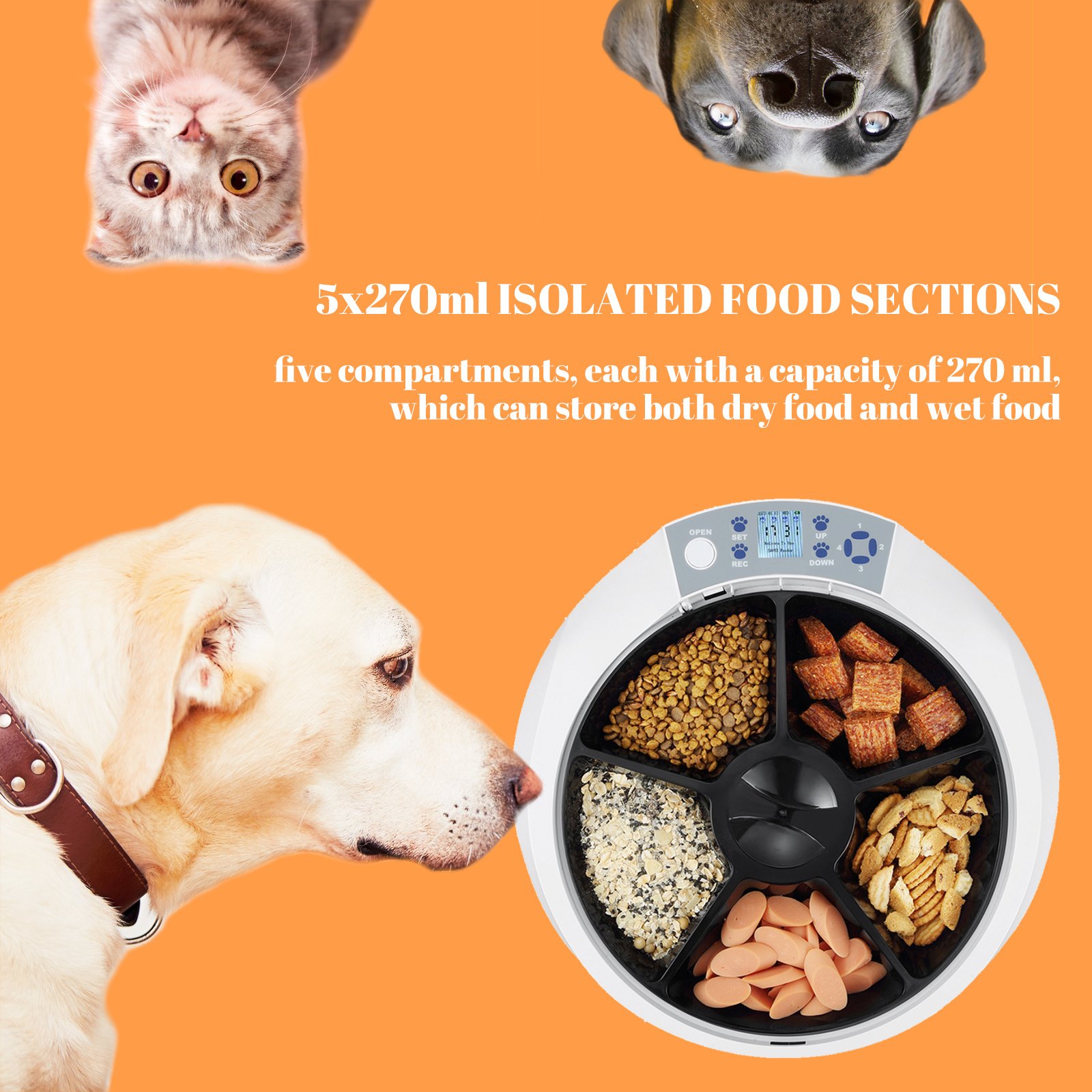 5-Meals Automatic Feeder Auto Pet Feeder 5x270ml Dry and Wet Food Dispenser Cat and Dog Food Dispenser Programmable Timer Portion Control with Voice R