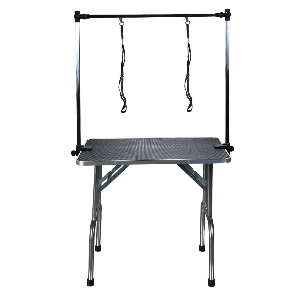  Solid construction and sturdy table. The table is ribbed rubber surfaced which ensures the pets' safety. Rust-resistant stainless steel legs and arms make it durable for use. Static-free board with skid resistance makes it easy to cleaned. The board with Rubber is waterproof and stable,hair and debris can be wiped down easily. Comes with a clamp-on Adjustable Grooming Arm and security nylon Loop. Rounded Aluminium edges for safety purposes. Collapsible and Easy to Assemble for convenient use and storage.