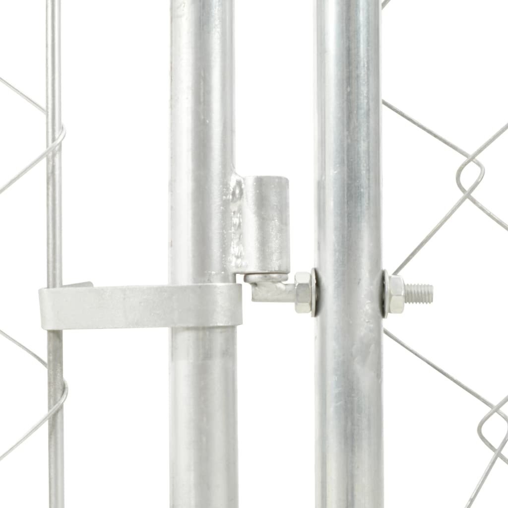 This large dog kennel provides ample exercise space while the chain link mesh all around helps prevent mischief and unexpected accidents while enabling ventilation. Thanks to the sturdy and heavy-duty galvanized steel construction; this quality dog kennel is durable and built to last. Made of 100% polyethylene; the included top canopy is fire-resistant and UV protected; providing protection from sun; rain; snow; as well as other weather conditions. The hinged door with lockable latch system ensures extra security and safety for your dogs. The kennel is easy to assemble. Please note that the door can be installed on the left or right side; which depends on your own needs.