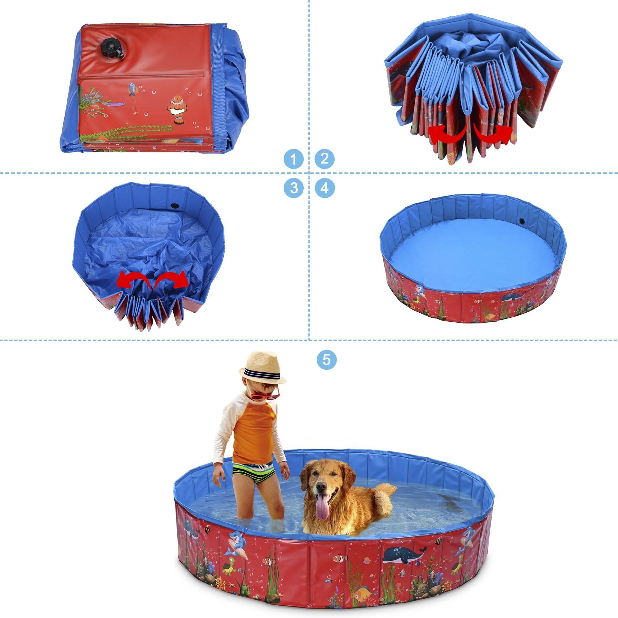 - Portable Pool - Pet Swimming Pool features folding structure for great portability; folding it into a compact size for space-saving storage or taking to everywhere; easily unfolding it at your home; backyard; garden and other outdoor places to offer a funny dabble time for your lovely pet or kids