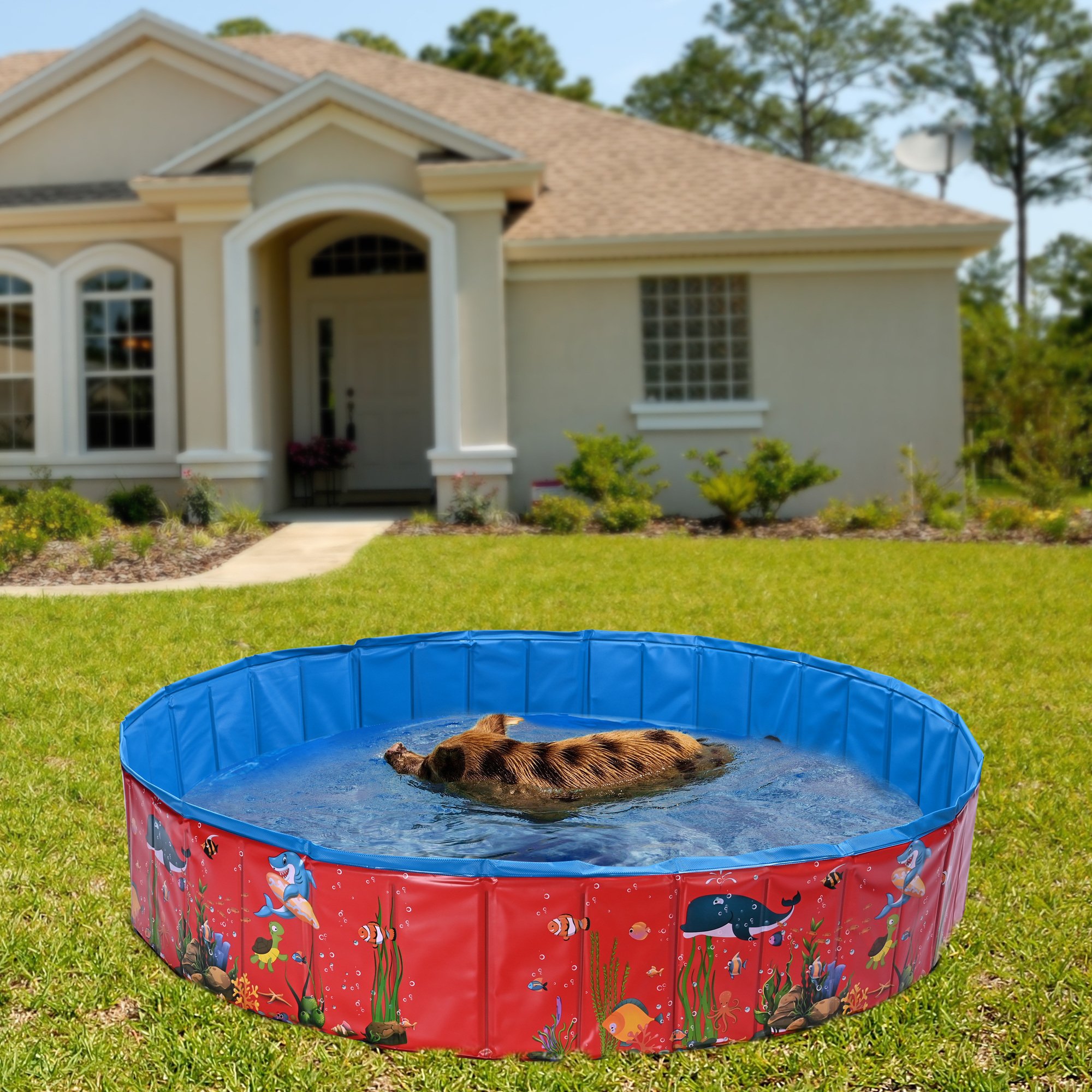 - Wide Application - 63"x12" pool fits for small dogs or children; a convenient toy allows them to swim; dabble and bath; With patterns on the covering; a lovely present for your pets or kiddies to get rid of the hot weather