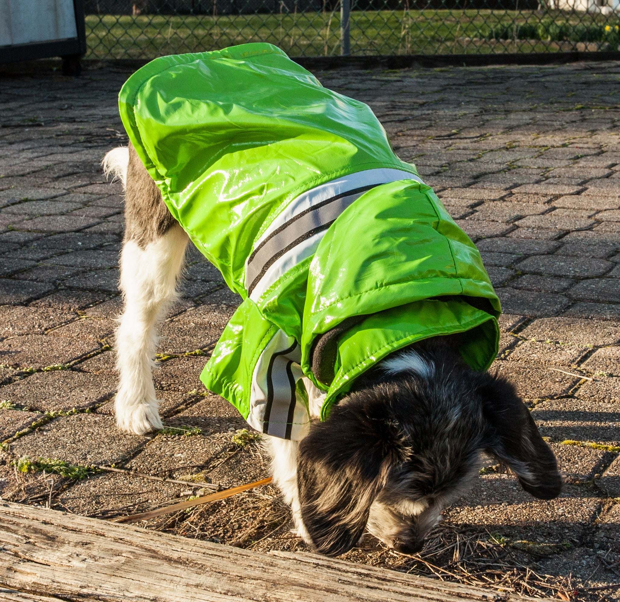 The Pet Life Reflecta-Glow Adjustable and Reflective Dog Raincoat is composed of a Waterproof PVC Material outer shell and inner lined with a thin layer of Fleece. This Dog Coat Features a fully Adjustable Removable Hood and adjusts at the tail end. Features a Reflective Strip along the back for added protection and safety. Features a Leash Slit along the Neck Area.
