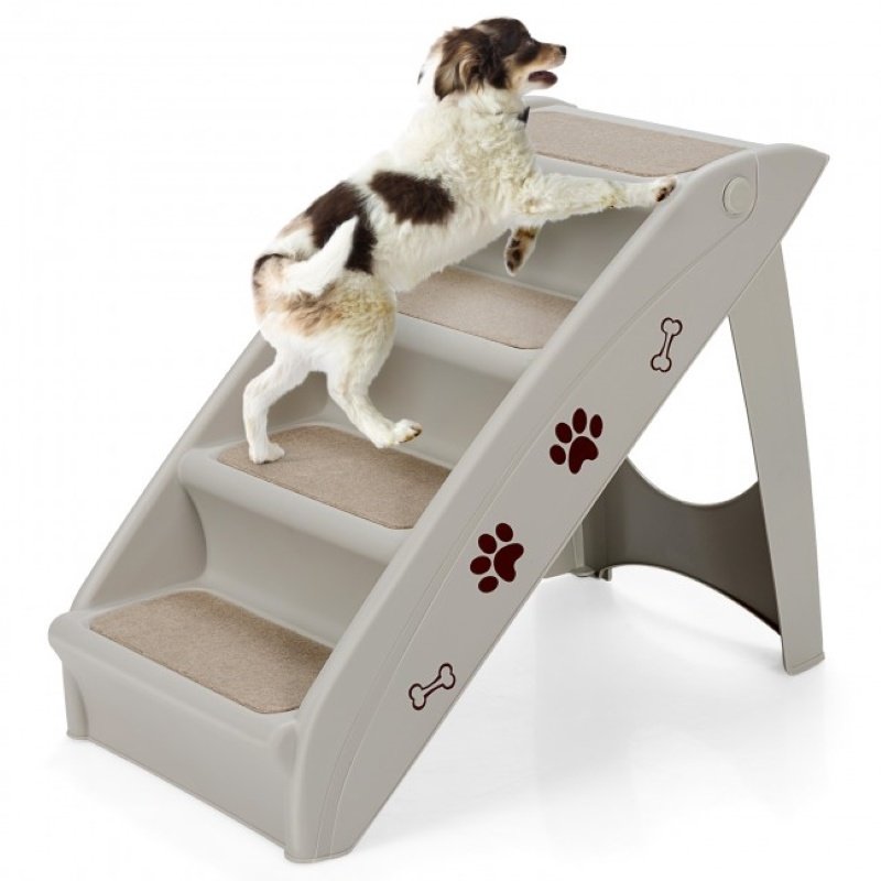 Helps pets reach their favorite destinations without much effortMade of premium PP material to ensure long service lifeThe built-in side rails keep your pet secureThe non slip foam pads protect your pet and your floorsAdhesive back felt step covers give your pet better tractionModerate stair heights is suitable for small and medium size petsLight weight 4 step pet stairs is portable for indoor and outdoor useFoldable step ramp can be stored under sofa or bedSmooth lines with cute patterns match your room decor wellChoose the best color from beige, gray and coffee.