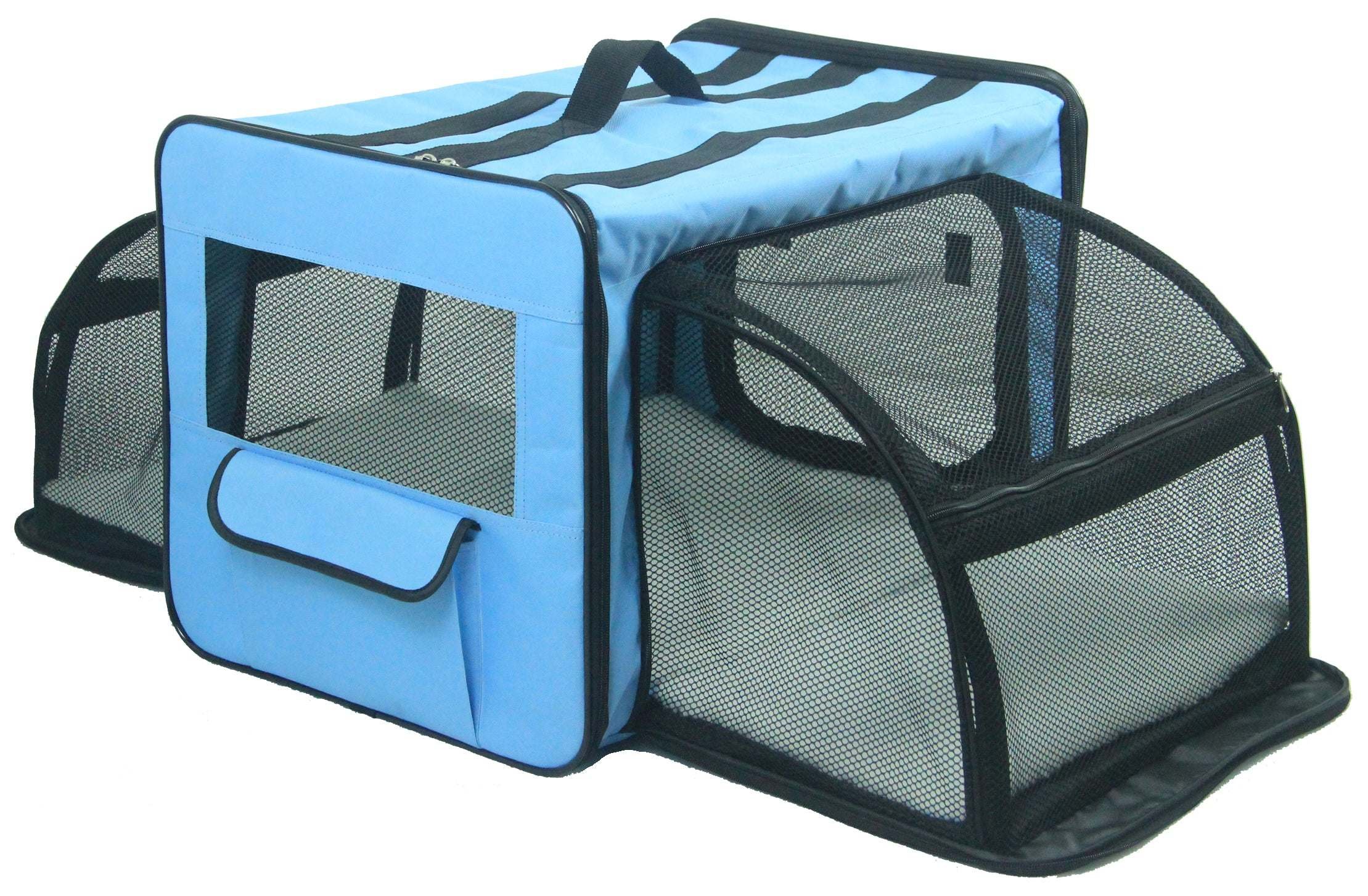 The Pet Life Capacious Expandable wire folding lightweight collapsible crate is composed of heavy-duty Ballistic Nylon and Mesh with bendable yet sturdy built-in flexible extenders that Velcro into place and hold up the 2 outer mesh expandable sides. Fully expands on both sides and collapses and folds. Perfect for multiple pets. Lightweight and great for traveling and indoor or outdoor usages. Features a spacious frontal breathable mesh entrance that rolls up and Velcro's into place, great for added sunlight visibility and exposure when opened with a back mesh window. Features dual reinforced stitching for added durability. Comes with an included reversible plush inner cushion that extends to cover the full surface area. Available in Multiple Colors and Sizes.
