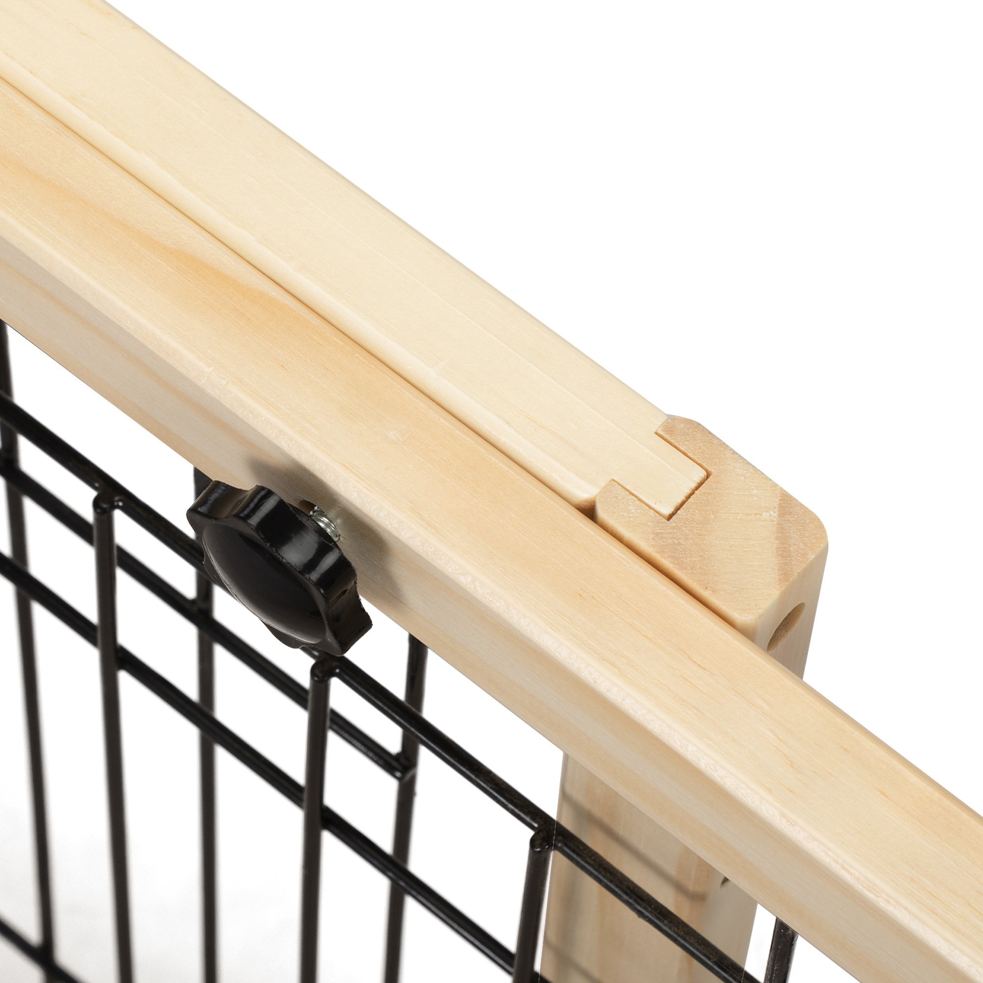 [Stylish Indoor Dog Fence]: This natural-finished wooden dog fence with wire meshes can blend into any decor of your house and act as an excellent way to limit your pets to other parts of your home.